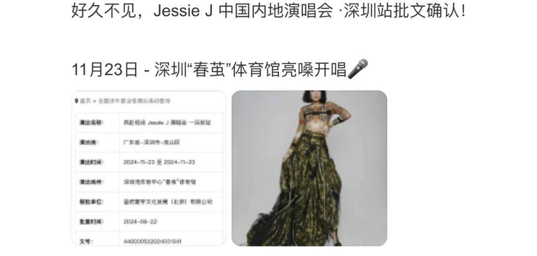 另一个即将访深的欧美歌手也与《歌手》密切相关,她就是曾全程参加《歌手2018》并一举夺魁的“歌王”结石姐。网传的Jessie J这轮巡演审批信息也出自文旅部官网,她基本已经确定即将于11月23日在深圳春茧体育馆亮嗓开唱。