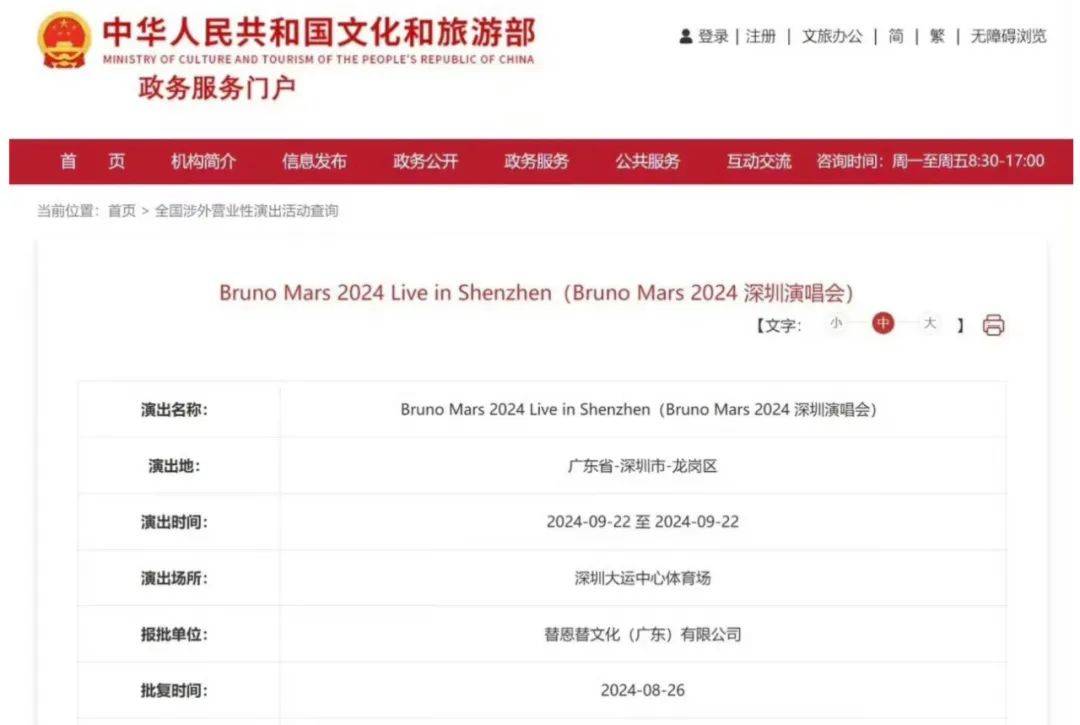 比如,深圳就将于9月和11月接连迎来两位国际歌手的惊喜空降。火星哥Bruno Mars造访深圳必定是个重磅新闻,微博近期流出的截图来自文旅部官方批复,基本是坐实了他将于9月22日在深圳大运中心体育场热力开唱。