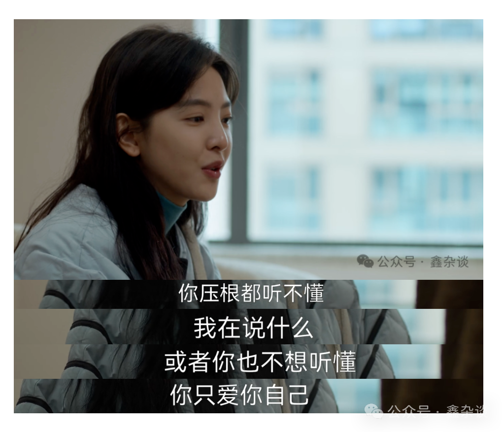 也是因此,在那隽上面那一段真诚但是明显有些问题的深情告白后,李晓悦的回答是:你压根都听不懂我在说什么,或者你也不想听懂,你只爱你自己。