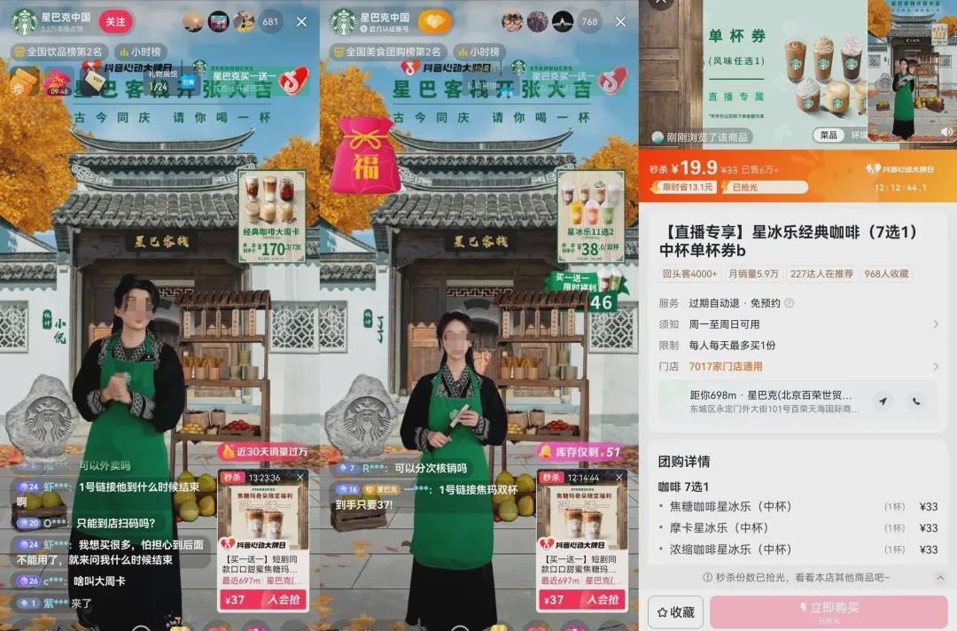 剧里主角提到的“39.9文两杯”、“第二杯星巴客栈请”等优惠活动,正和星巴克中国直播间所主打的优惠一致;官方直播间的装扮也呼应了剧内风格,以星巴客栈为背景,主播穿上剧中主角同款服饰,售卖短剧同款饮品,比如火晶柿子星冰乐、柚子铁观音茶拿铁、板栗红豆沙,秒杀价19.9,焦糖玛奇朵(燕麦/焦糖/金烘焦糖)37块钱买一送一,直播间里所售卖的产品折扣低至4.9折。