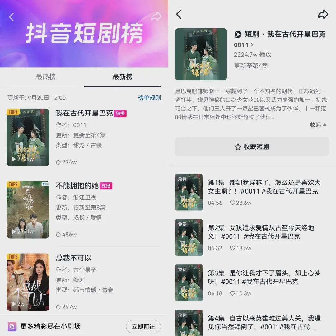 《我在古代开星巴克》登上抖音短剧最新榜Top1