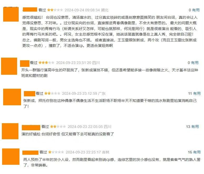 “非常端着”“台词好奇怪”“不知道要干啥的流水账”“王玉雯跟张新成不适合演cp”“刻意搞笑”