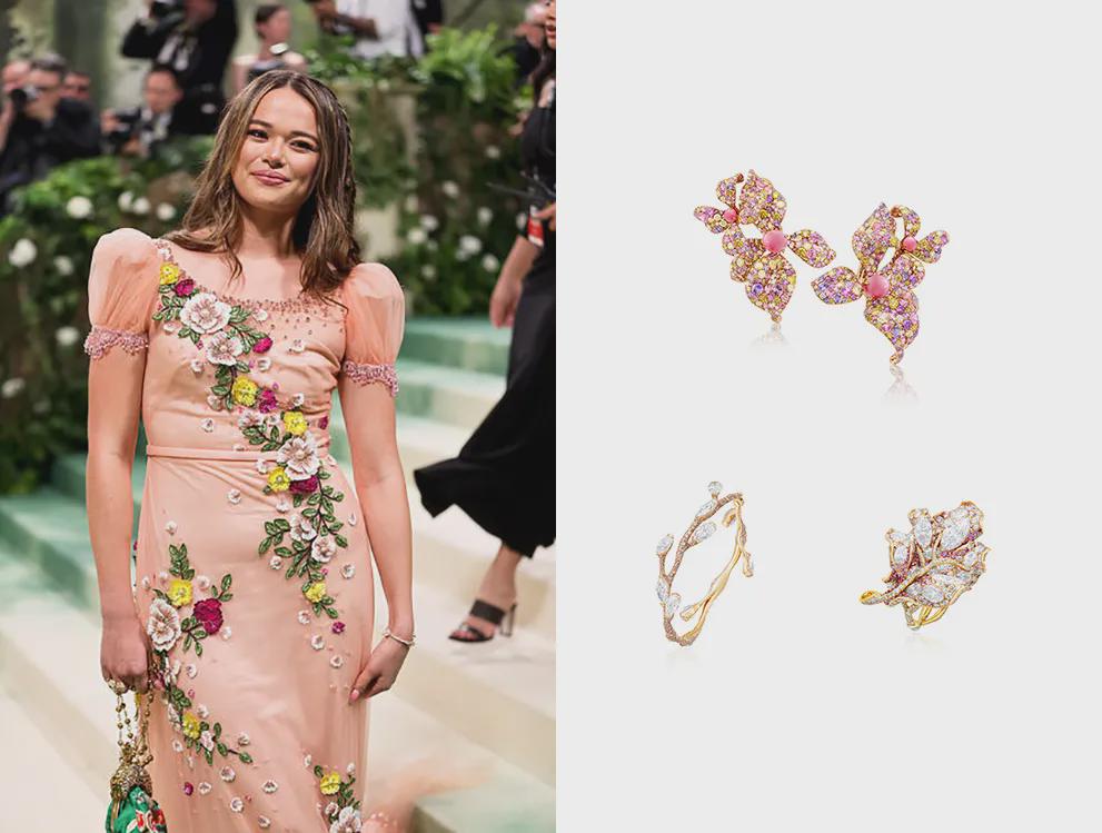 Pick了White Label高级珠宝四季系列树枝手环,以及白钻叶片戒指,母女凑成了一对,同时她还佩戴White Label高级珠宝花园系列的小花耳环,白粉色洋溢着青春活力。