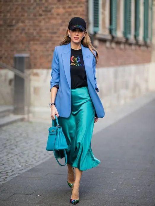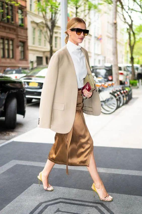 当属西装+缎面裙。