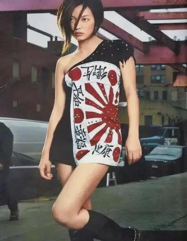 从拍摄杂志时,身披带有日本军旗元素的布料。