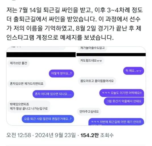 上传该文章的网友A某表示:“今年7月在下班路上要到了B选手的签名,之后又三、四次要到B选手的签名,就这样B选手记住了我的名字。上个月2日比赛结束后,他通过SNS私信给我发送了信息。”