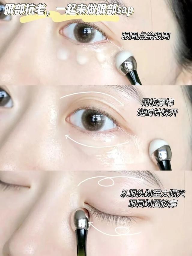 我一般以眼霜按摩棒,从眼头划至太阳穴,在眼周画圈按摩,让它慢慢吸收,姐妹们,记得要坚持使用哦,持之以恒的道理大家都懂吧~