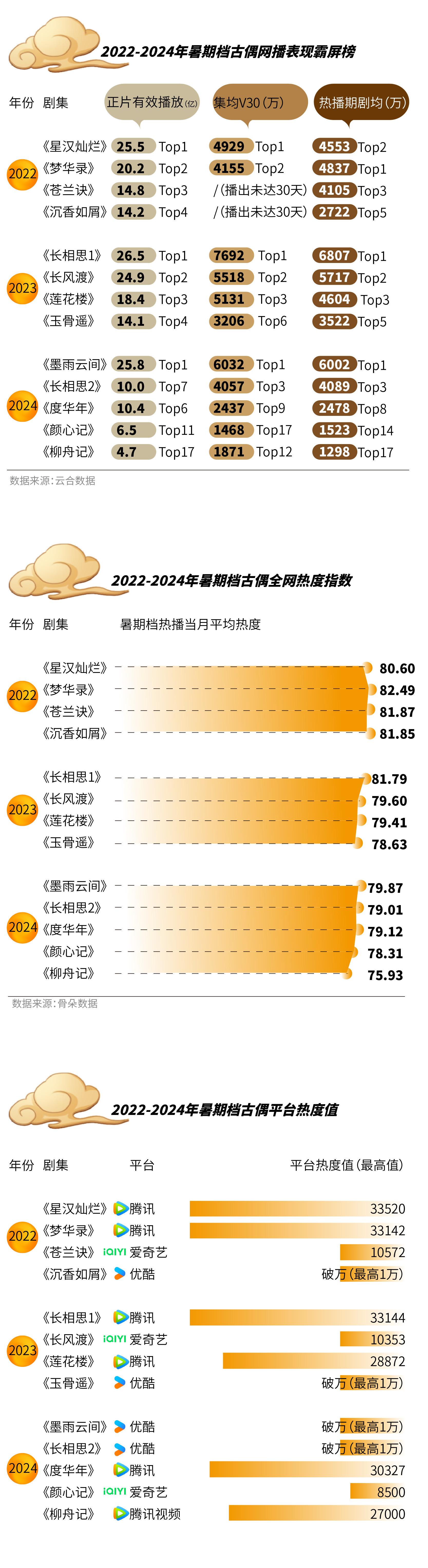 反观2024年刚结束的暑期档,各类数据榜单中,古偶剧的成绩不再那么亮眼和突出了。云合数据发布的2024暑期档剧集网播表现霸屏榜中,正片有效播放除了《墨雨云间》遥遥领先,有效播放达25.8亿,在古偶里排第二的《度华年》有效播放直接腰斩到只有10.4亿,《长相思第二季》同获10亿有效播放;集均V30榜和热播期集均榜中前10名仅有《墨雨云间》《长相思第二季》《度华年》三部,且并未能均位于榜单的前三名。收视热度下降之外,2024年暑期档古偶剧的得分也不如人意。以豆瓣评分为例,热度最高的《墨雨云间》评分6.6,其他古偶剧的评分也基本在及格线徘徊:《四海重明》6.3分,《度华年》6.2分,《长相思 第二季》5.9分,《颜心记》5.9分,最佳成绩的《柳舟记》评分也从8分跌到了7.8分。