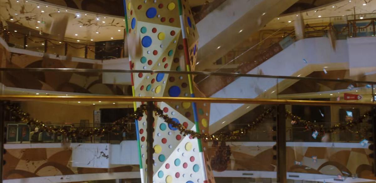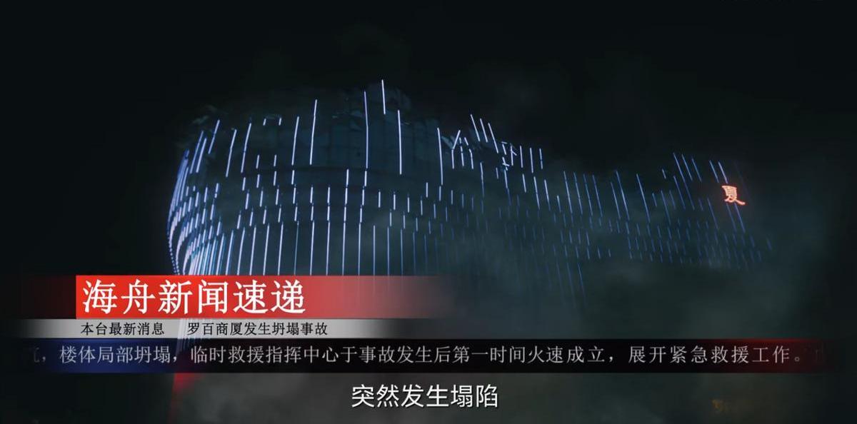 沉降事故发生,大厦上的霓虹灯一闪一闪,砖石瓦砾从高处掉落,人群尖叫着从商场大门涌出。