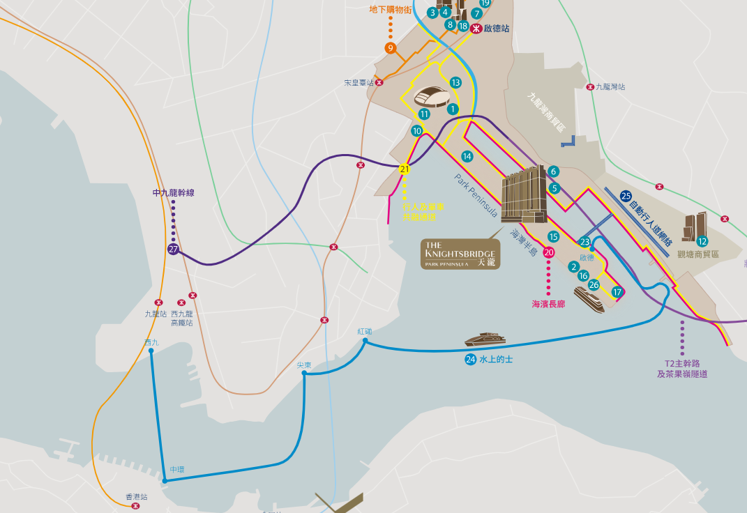 项目距离屯马线启德地铁站车程8分钟或可乘坐巴士直接到达,通过启德地铁站4站直达红磡站,5站直达会展站,6站直达柯士甸(西九龙高铁站),通过西九龙高铁站,15分钟达到深圳福田,半小时通达大湾区。