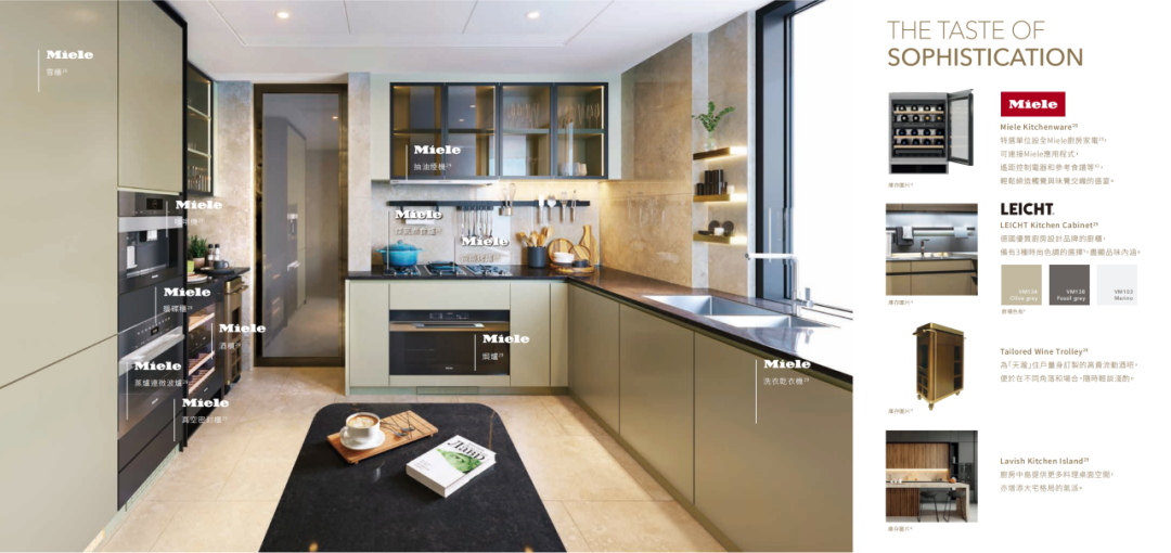 项目全系精装修,拎包入住,厨房配备德国Miele多件套(抽油烟机、燃气灶、蒸烤机、酒柜、微波炉、洗烘一体机等)、德国LEICHT、意大利Poliform、意大利Cristal、英国Claybrook、日本Panasonic等国际品牌云集一身(以实际交付为准)。