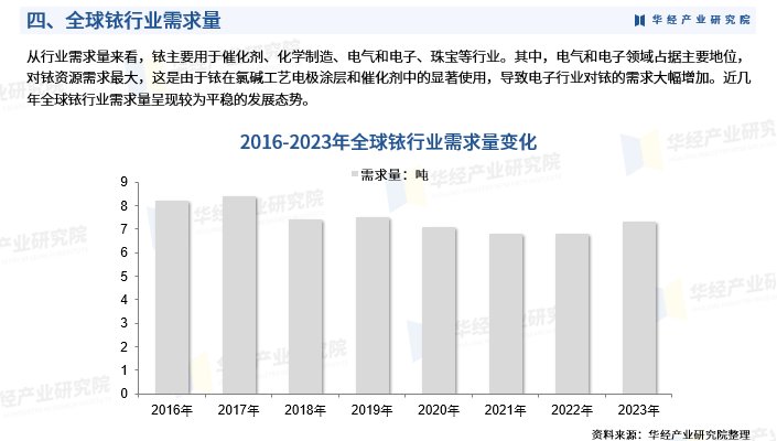 从行业需求量来看,铱主要用于催化剂、化学制造、电气和电子、珠宝等行业。其中,电气和电子领域占据主要地位,对铱资源需求最大,这是由于铱在氯碱工艺电极涂层和催化剂中的显著使用,导致电子行业对铱的需求大幅增加。近几年全球铱行业需求量呈现较为平稳的发展态势。