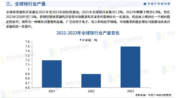全球铱资源的开采量在2021年至2023年间有所波动。2021年全球铱开采量为7.2吨,2022年略微下降至6.9吨,但在2023年又回升至7.5吨。表明尽管铱资源的开采受市场需求和开采条件影响存在一定波动,但总体上维持在一个相对稳定的水平。铱作为一种稀有且重要的金属,广泛应用于电子、化工和电化学领域,市场需求的稳定增长可能推动未来开采量的进一步提升。
