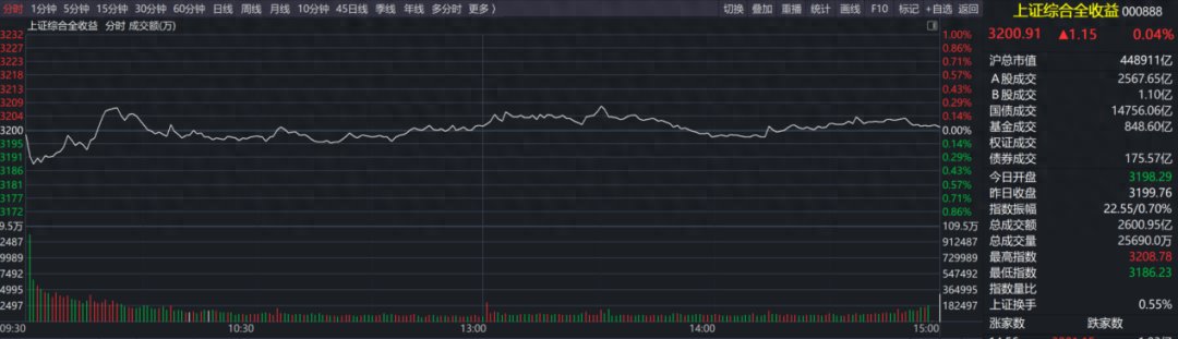实时行情显示,当天,上证收益以3198.29点开盘,全天在开盘点位附近徘徊,截至收盘,该指数上涨0.04%,报收3200.91点。
