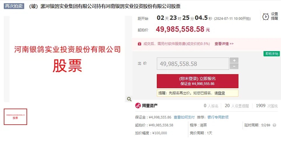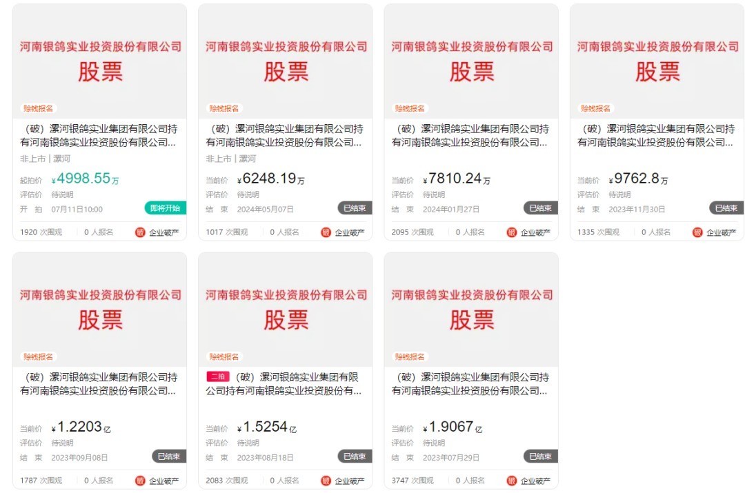 【大河财立方 记者 陈玉尧】7月8日,大河财立方记者获悉,河南银鸽实业投资股份有限公司(下称“银鸽投资”)1.54亿股股份再次被挂牌司法拍卖,起拍价4998.5万元,7月11日开拍。该拍卖标的为漯河银鸽实业集团有限公司(下称“银鸽集团”)破产涉及的资产。