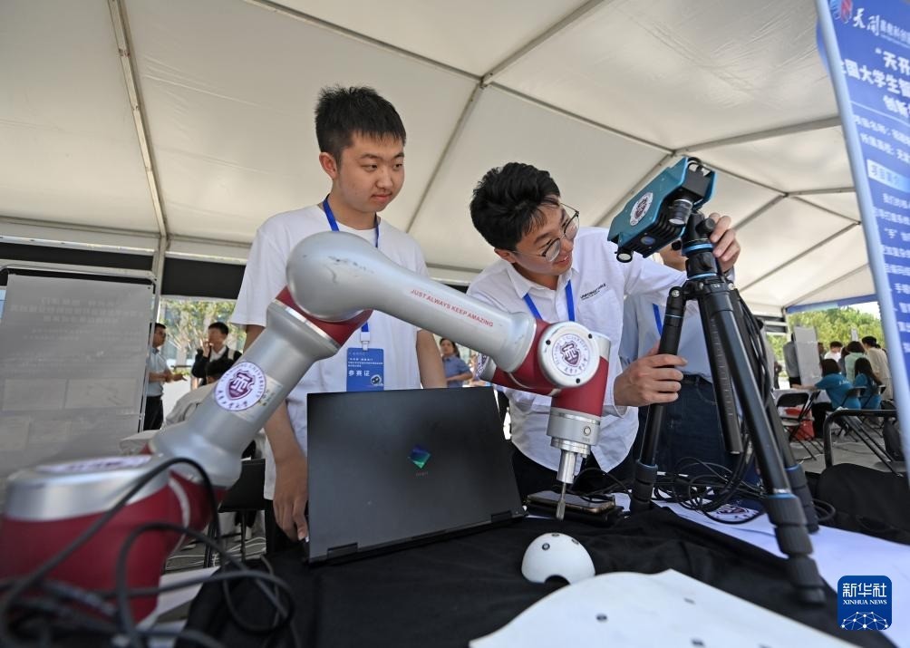 在天开园天开广场,参加“天开杯”创聚津门全国大学生智能科技创新创业挑战赛的天津工业大学学生在调试参赛产品(5月14日摄)。