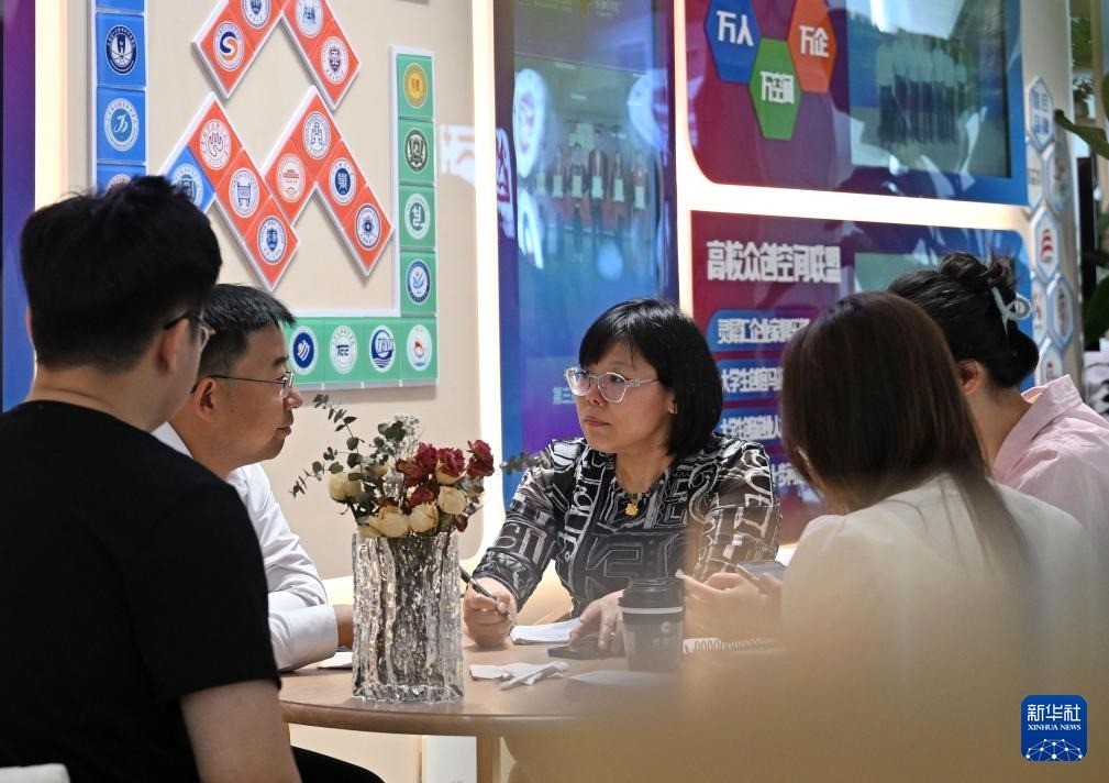 创业者在天开园天开广场的一家众创空间内讨论(5月14日摄)。