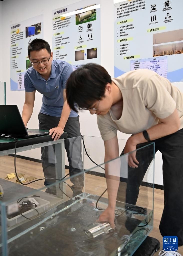 在天开园天开广场的办公楼内,天津市天开海洋科技有限公司创始人胡浩丰(左)和助手一起调试水下偏振相机(5月14日摄)。