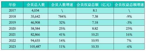 要知道,在2020年-2022年时间里,其会员权益总额增速虽然在一步步滑落,但仍然保持一定增长态势,并没有出现像去年那样退步。期间会员权益总额分别为8.82亿元、10.21亿元、10.95亿元,增速分别为23%、16%和7%。