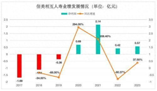 然而,到了2022年,信美相互人寿盈利能力突然急转而下,当年仅实现净利润0.42亿元,同比下降了80.37%。2023年业绩情况则有所回暖,净利润升至0.57亿元,同比增速达37.5%。