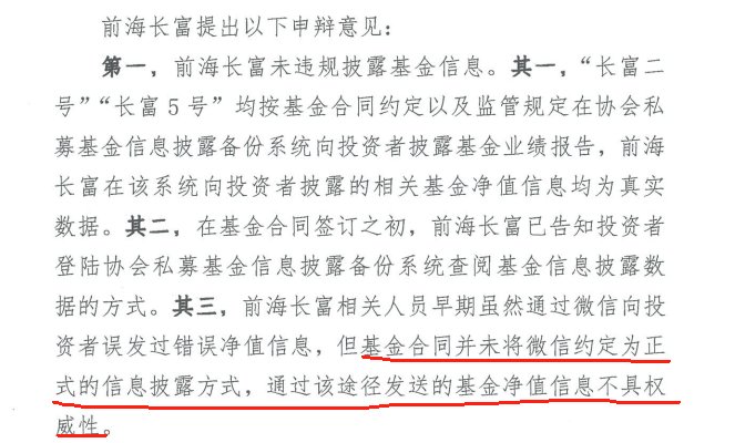 前海长富还申辩称,公司并没有违规披露,系统披露的都是事实数据,员工在微信上更新净值不作数,这是因为在合同中并没有约定微信为正式的披露方式;而且还不承认自己不配合调查,称只是办公场地租赁到期,和协会检查人员沟通出了披露,彼此都存在误解。