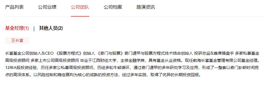 根据介绍,公司创始人&CEO王长富有12年A股投资经验,历任多家公私募高级投资顾问,历经多轮牛熊循环,通过奇门遁甲的多年研究学习及应用,形成了一整套以奇门卦断时间拐点的高深体系。