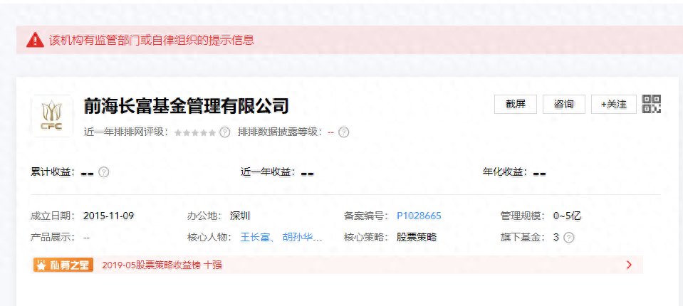 这家私募的全称叫前海长富基金管理有限公司。根据私募排排网数据,这家公司成立于2015年,将近有10个年头,公司核心策略为股票策略,管理规模不算大,在0--5亿元之间,属于小型私募。