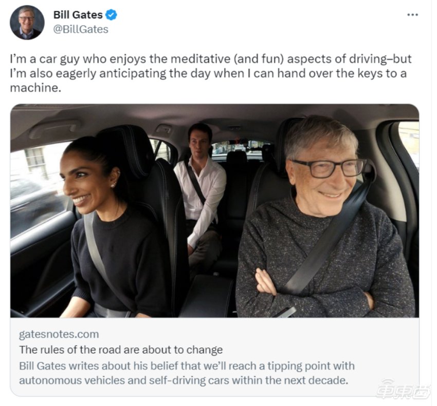 同时,2023年3月31日,比尔・盖茨应邀体验了英国初创公司Wayve开发的无人驾驶出租车。这次试乘的行程中,比尔・盖茨、Wayve的联合创始人兼CEO Alex Kendall以及一位安全驾驶员共同乘坐在车内。