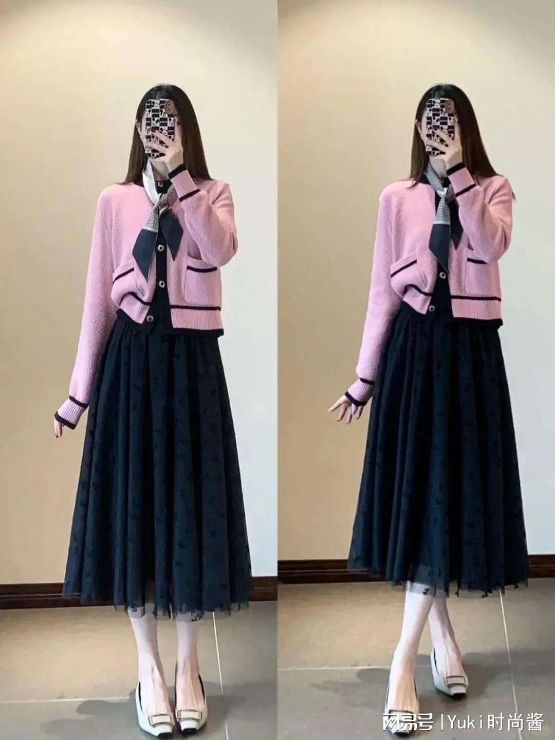 选择一件浅粉色的针织衫,搭配一条黑色的高腰A字裙,色彩上形成温暖的对比,同时A字裙的版型能够很好地修饰身形,拉长腿部线条。