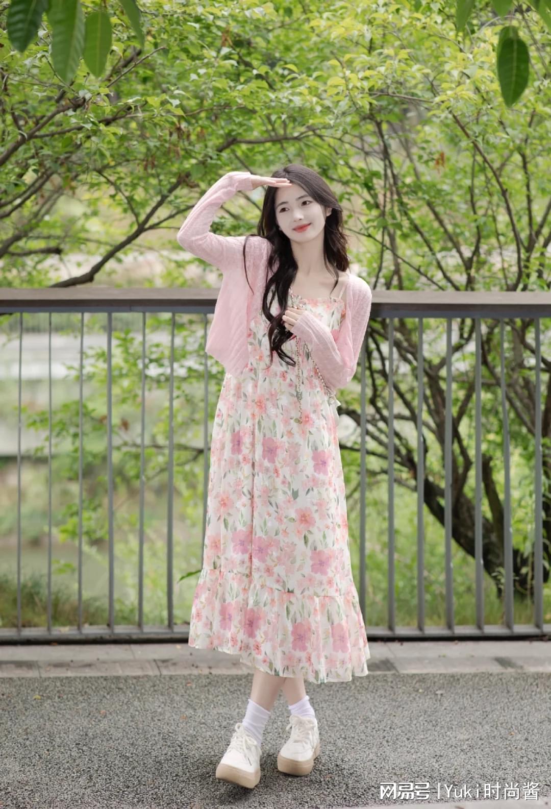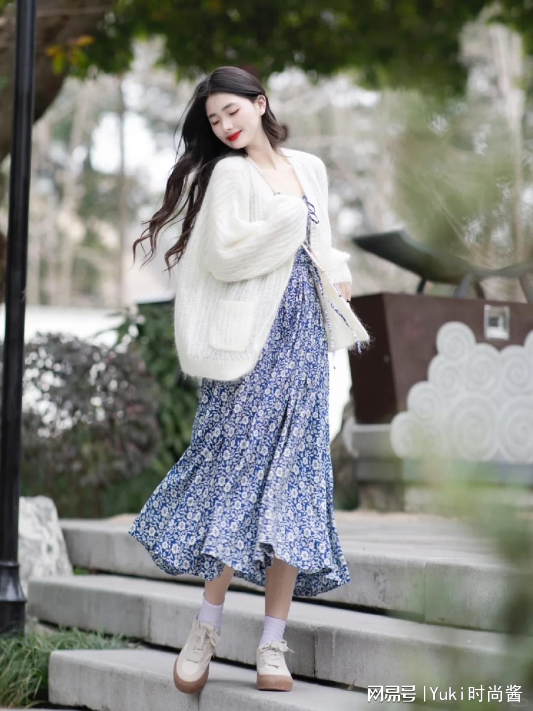 针织开衫与碎花长裙的组合,仿佛是从旧时光中走来的文艺少女,带着淡淡的复古情怀。选择一件浅米色或淡粉色的针织开衫,内搭一条以深色为底的碎花长裙,色彩上形成温柔的层次感,开衫的随性与长裙的飘逸相得益彰。