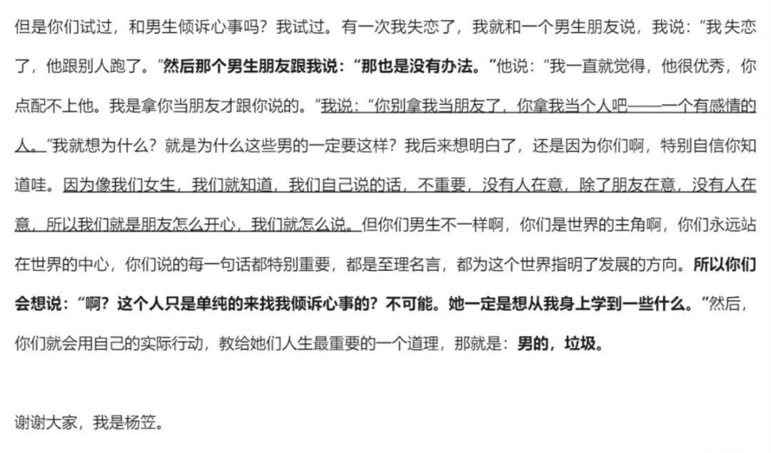 “男人,垃圾”呢?杨笠的原文也是有限定条件的,指的是对女性好友的遭遇毫无共情、在人疗伤之际也要站在世界中心发表演说的“导师”。