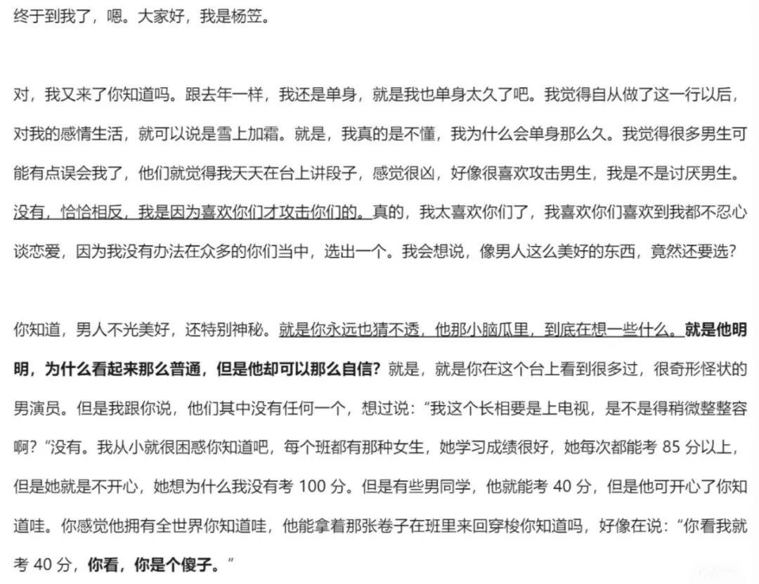因为破防不是一蹴而就的,是随着舆论战争的扩大化渐渐弥散的。看杨笠的“普信”段子全文,其实可以知道,“普信”梗作为一块石头,砸的是“长相普通却从来没有容貌焦虑”“考40分宛如考100般自信”这群人。