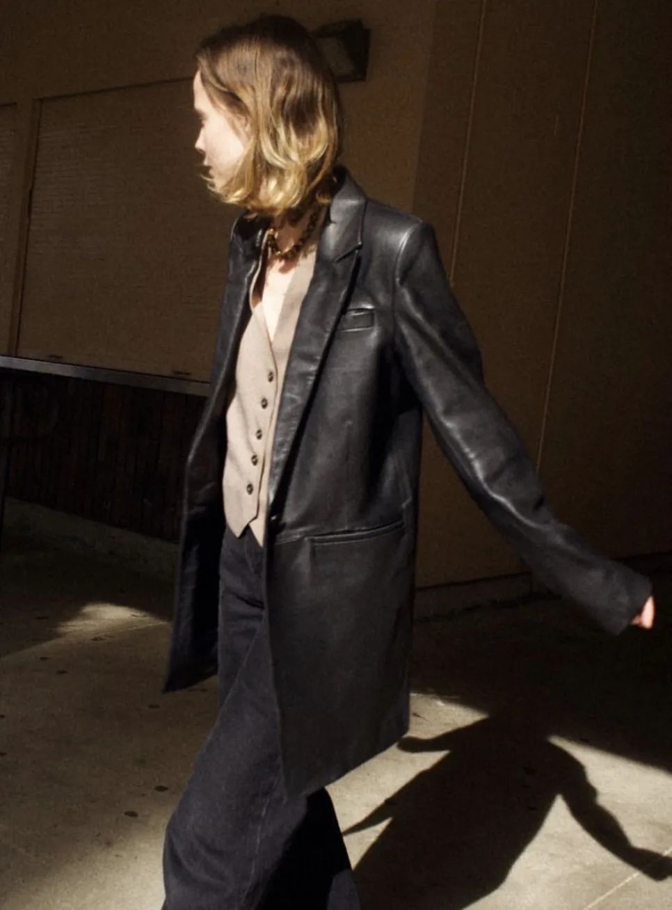 如果想要风格更为强烈,除了黑色,还需要 Lemaire 秀场上这种棕色系的皮质风衣。