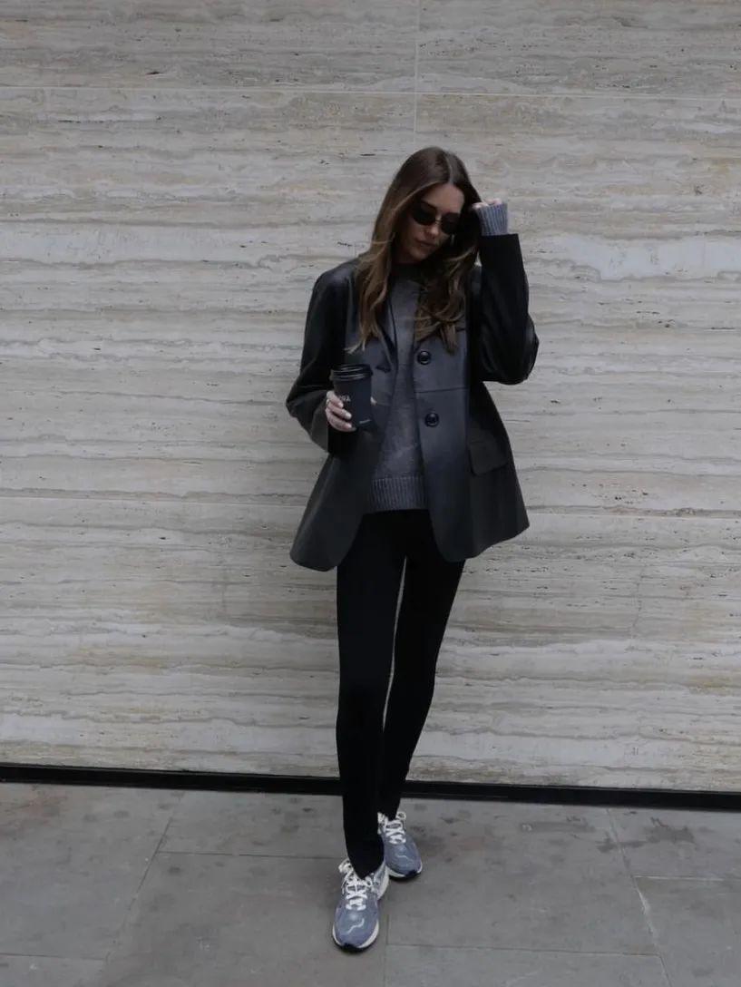 宽松廓形、大口袋设计以及宽边缝线、黑色扣子,都让皮质西装与职业装区分开来,拥有一丝叛逆的学院风。