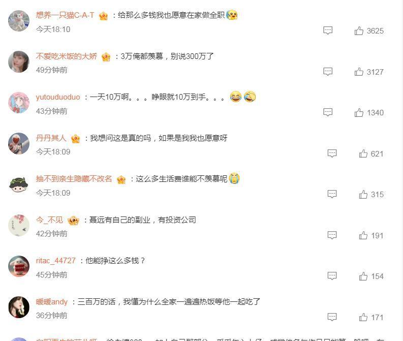 一方面是被300万这个数字吓到,虽然这个数字对于娱乐圈明星来说不算很多,但是一年300万,一年就是3600万,十年不得3.6亿了吗?而且这还只是生活费,不算其他大额开支,那妻子即使不出去上班,不当明星,也能攒下亿万财富啊,生活费应该花不了这么多。