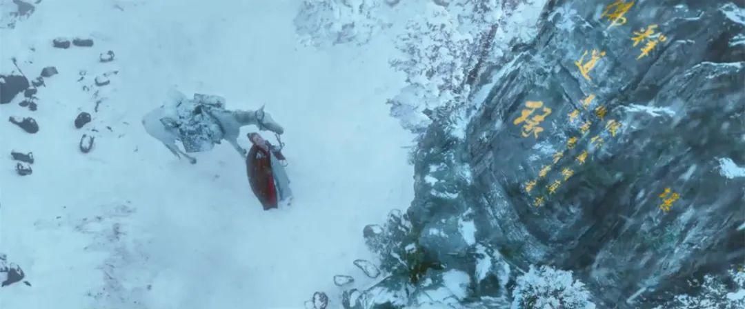 在预告片里,宝玉站在刻有“佛释道缘”的大石头面前,牵着一匹马,迎着风雪。