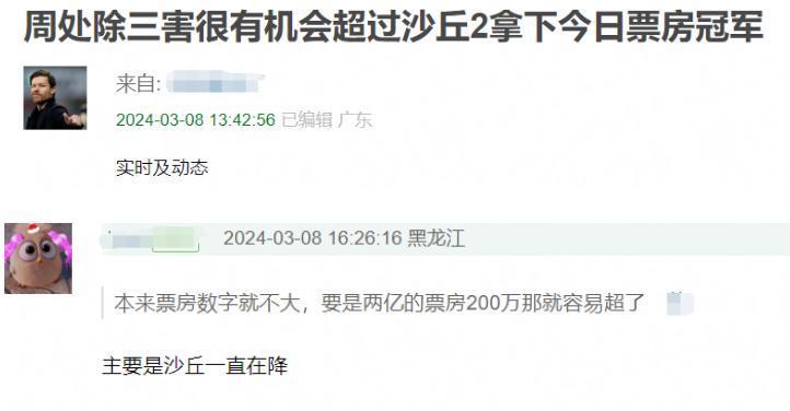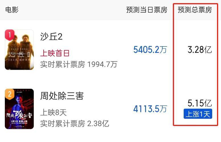 虽然目前《沙丘2》日票房还是处于第一,但是整体表现很是一般,预测票房一降再降,根据专业购票软件分析,《沙丘2》预测总票房仅3.28亿,而《周初除三害》预测总票房超5亿。