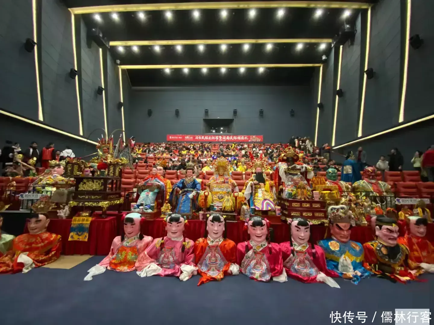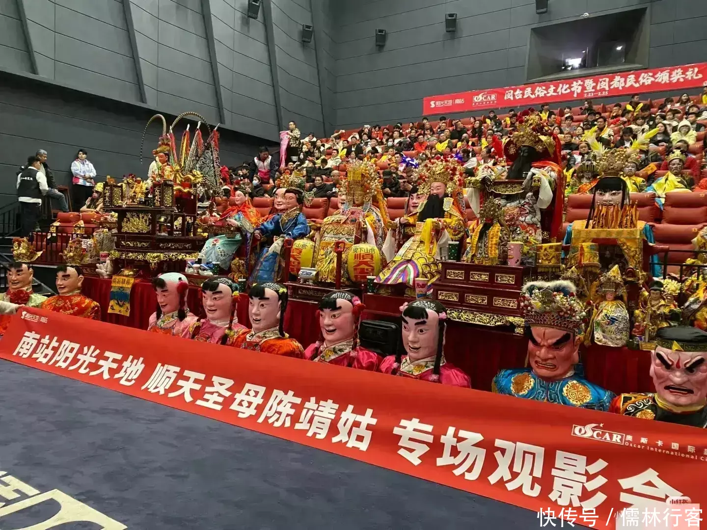在影厅中场面十分壮观,神仙们都坐在前排中间位置,正中心被簇拥着的是顺天圣母,为什么她能坐在中间呢?因为下面的横幅写了,这是“顺天圣母陈靖姑专场观影会”。