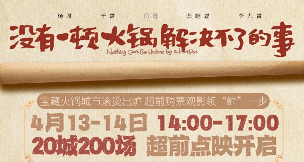 由丁晟执导、杨幂、于谦、田雨、余皑磊、李九霄领衔主演的悬疑喜剧《没有一顿火锅解决不了的事》将于5月1日在全国正式上映,作为五一档最受瞩目的影片之一,电影每一步动作都备受瞩目。此前,电影开启了在南昌、柳州开启超前尝鲜观影活动,口碑表现亮眼。今日片方再接再厉继续“点亮中国火锅地图”之旅,正式官宣将于本周末4月13、14日两日14:00-17:00,在全国20城举行200多场超前点映,与多个城市的观众零距离互动,正式开启一场飘香四溢的全国“火锅”团聚盛会。