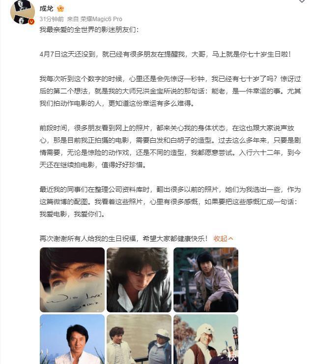 成龙在发文中写道:“4月7日这天还没到,就已经有很多朋友在提醒我,大哥,马上就是你七十岁生日啦!我每次听到这个数字的时候,心里还是会先惊讶一秒钟,我已经有七十岁了吗?惊讶过后的第二个想法,就是我的大师兄洪金宝所说的那句话:能老,是一件幸运的事。”
