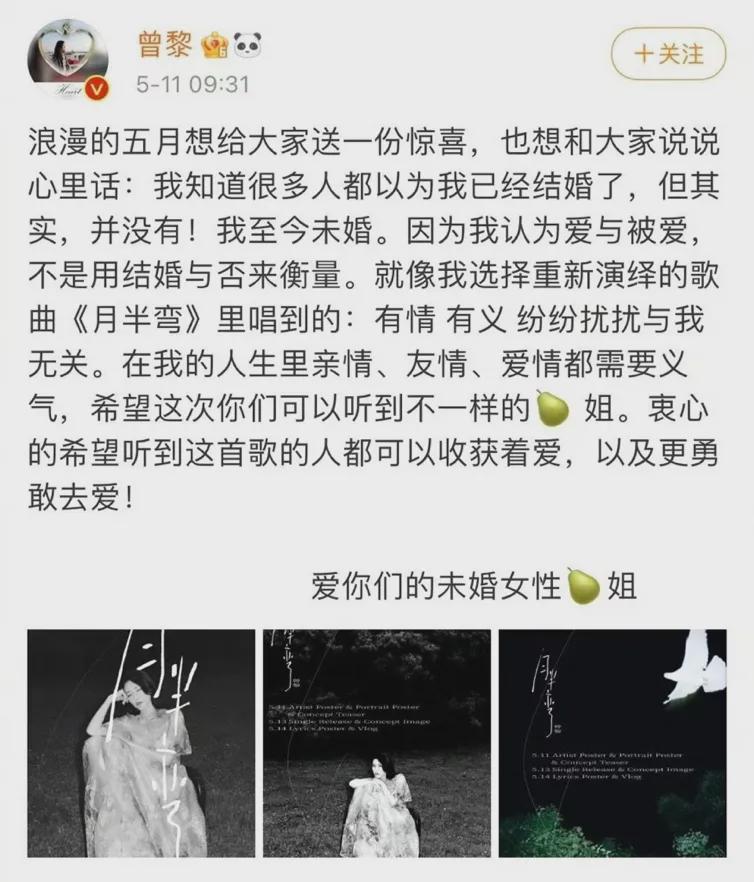 2021年5月,曾黎忽然在微博上发了一条“我至今未婚”的微博,迅速冲上了热搜。