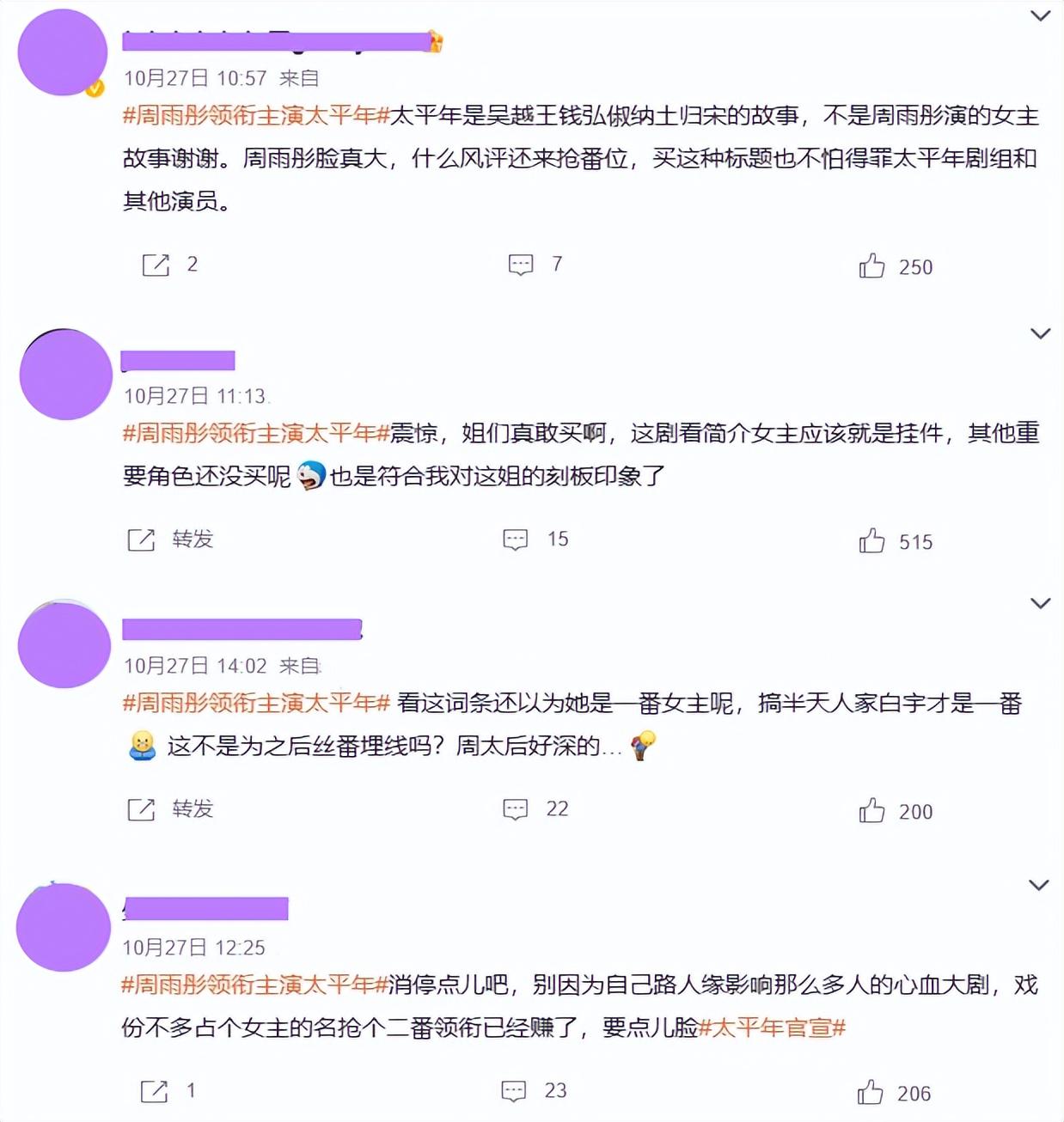 所以当我看到“周雨彤领衔主演《太平年》”这个词条时,不禁感到惊讶,没想到她的团队脸皮如此之厚,不知道的还以为她这是什么大女主剧呢。