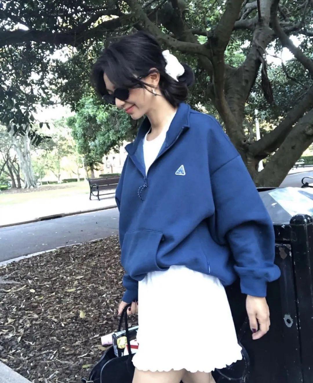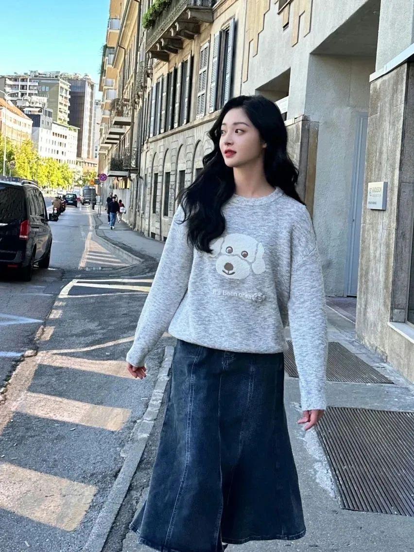 像是周洁琼的小狗灰色卫衣就很生动,搭配牛仔半裙,既舒适日常又不会显得太过普通,很适合出街的时候来穿。