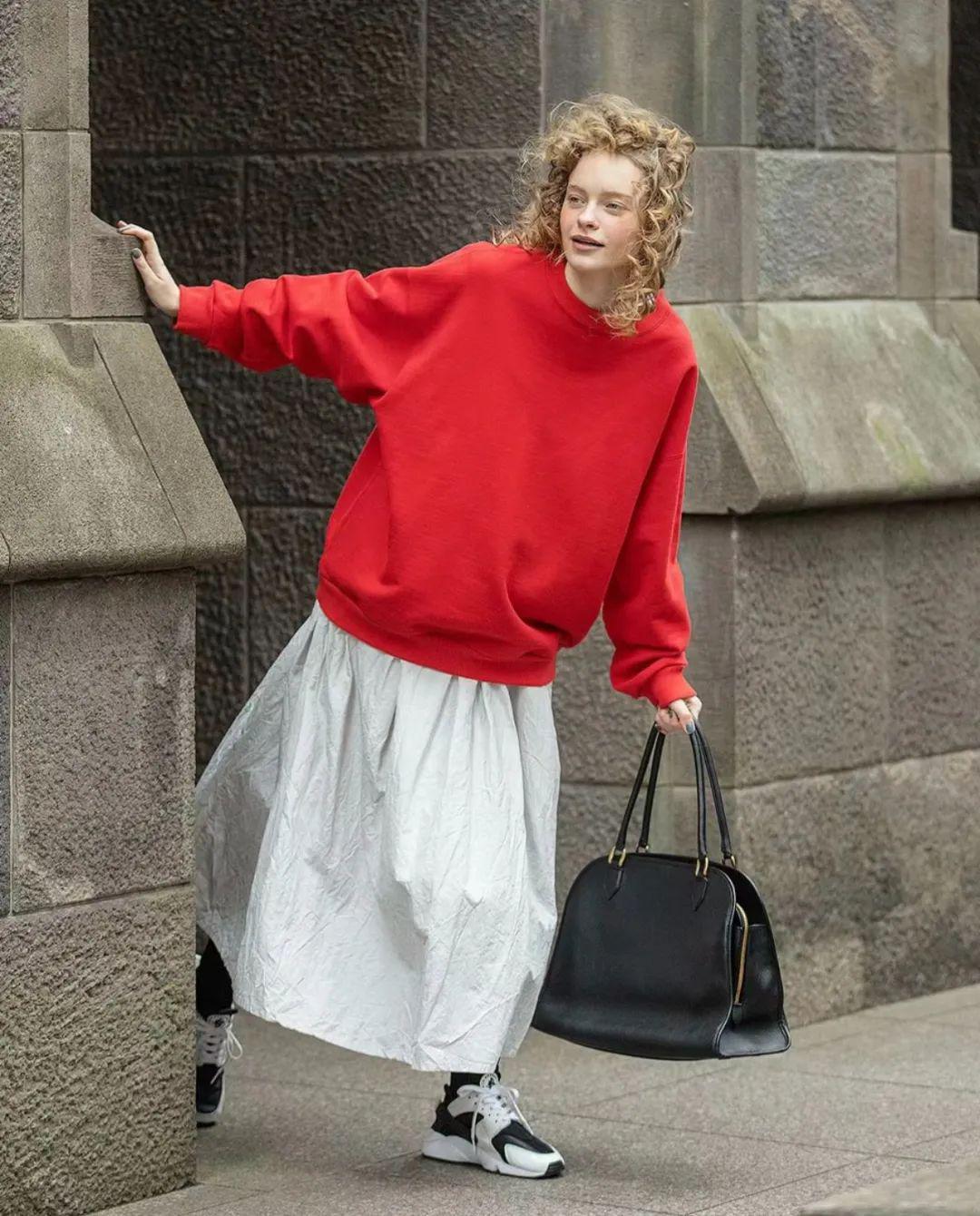 卫衣配裙轻松但淑女,是秋冬的绝妙搭配。