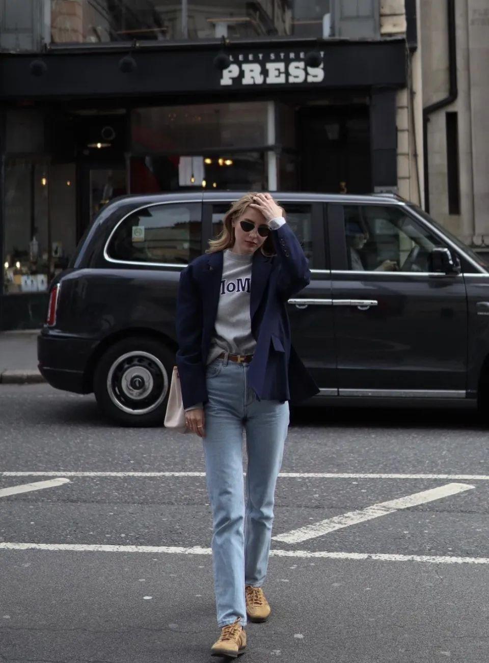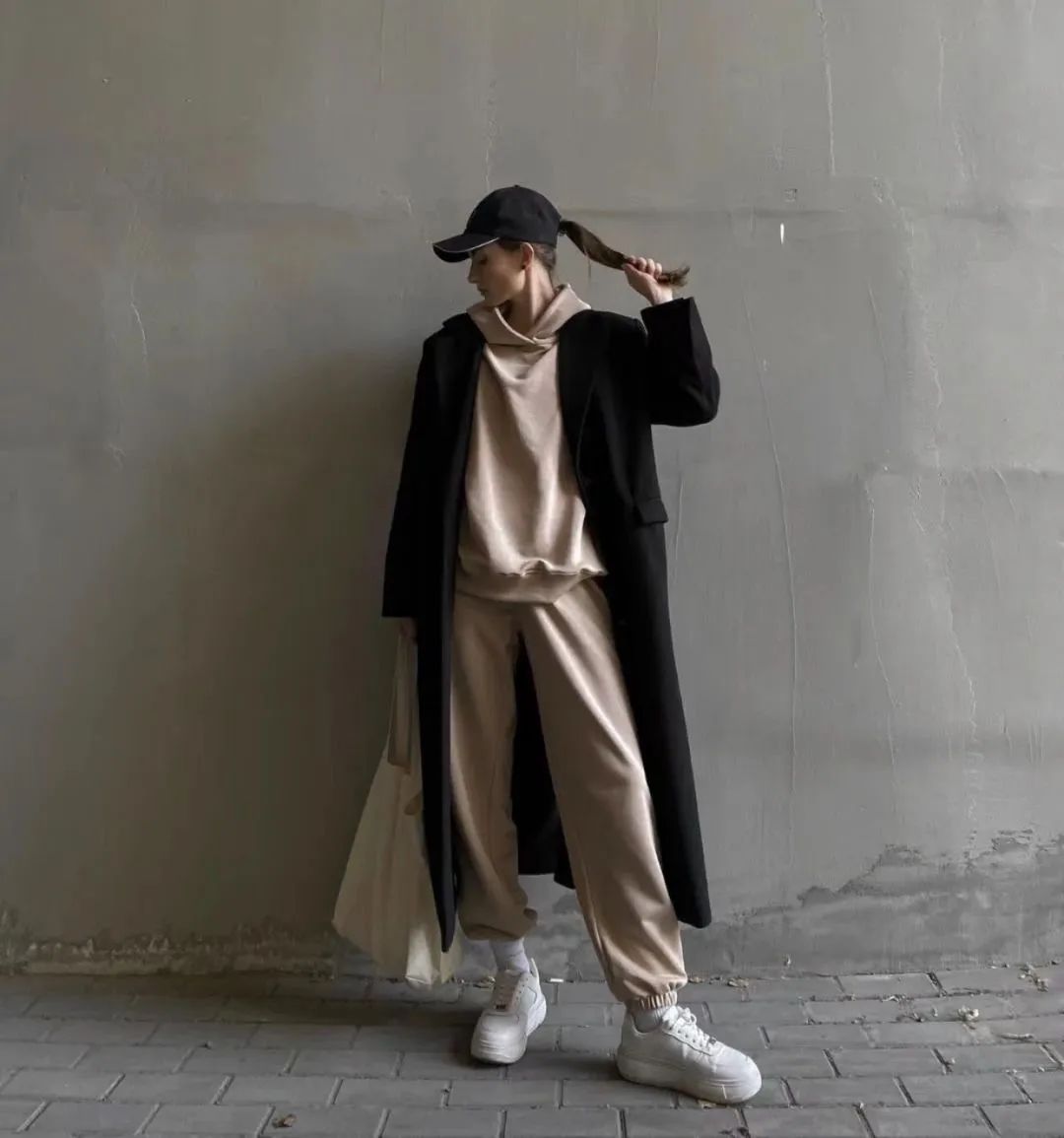 大衣与卫衣的组合,更加偏向活力十足的运动风,色彩低调时就会有老钱风的感觉。