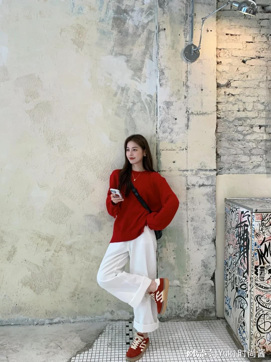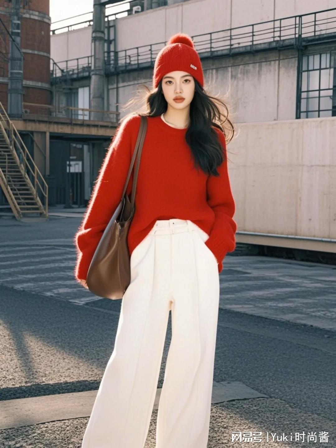 搭配一条简约的白色阔腿裤,或是高腰的牛仔裤,都能营造出一种随性而不失格调的氛围。如果想要进一步提升整体造型的时尚感,不妨尝试在颈部系上一条细长的黑色丝带,或是搭配一款设计感十足的金属项链,让红色毛衣的温柔与你的个性相得益彰。