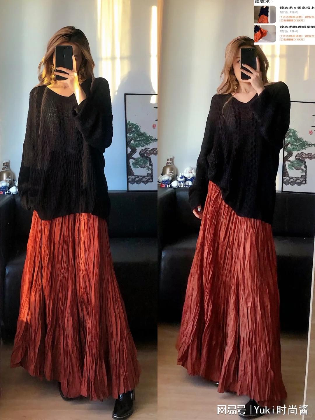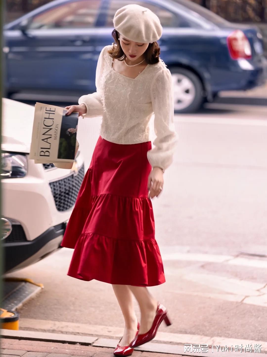 选择一款剪裁流畅的红色半身裙,搭配一件深色的修身针织衫,既展现了女性的优雅与魅力,又通过颜色的对比增强了层次感。脚穿一双黑色高跟鞋,让腿部线条更加修长,整体造型更加高级与时尚。