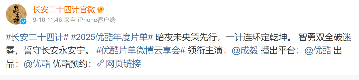 从《长安二十四计》官宣当日就挂出主演成毅就可以看出,这部原创剧没有原始的IP流量,目前全靠男主成毅来吸流。