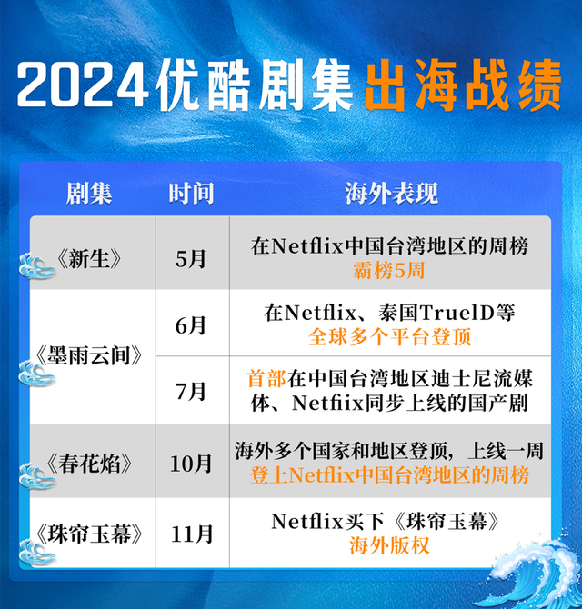 6月,优酷出品的“解压神剧”《墨雨云间》在全球多个平台登顶。6月17日,《墨雨云间》在Netflix上线3天后登顶Netflix中国台湾地区日榜;6月18日,《墨雨云间》在泰国当地播出平台TrueID登顶;6月19日,在韩国流媒体平台MOA登顶;7月,《墨雨云间》上线Disney+,成为首部在中国台湾地区迪士尼流媒体、Netflix同步上线的国产剧。