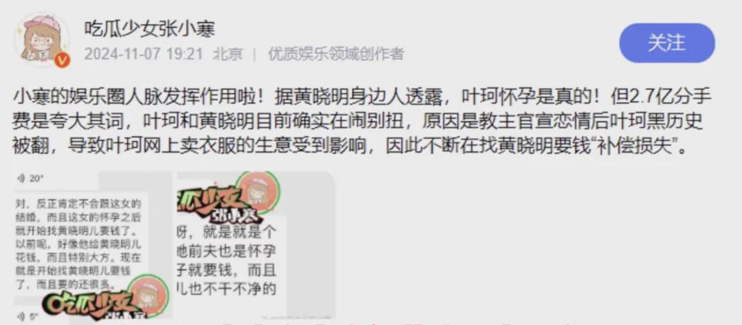叶珂怀孕是真的,2.7亿分手费夸大其辞,黄晓明和她确实现在有矛盾。